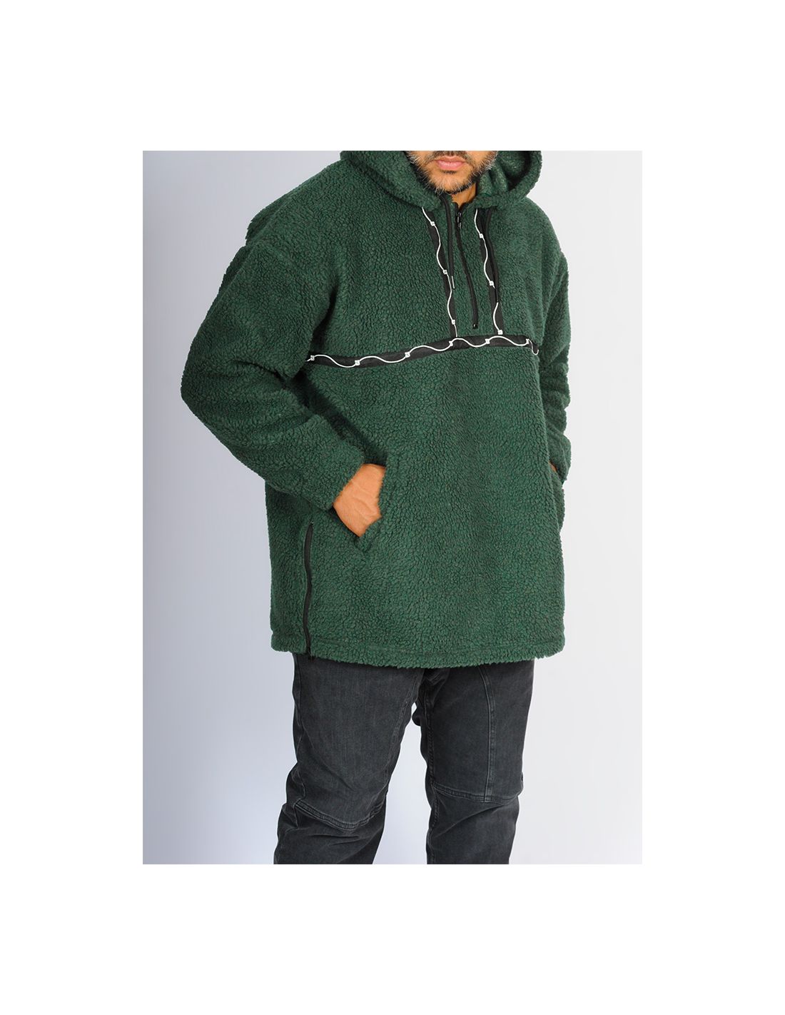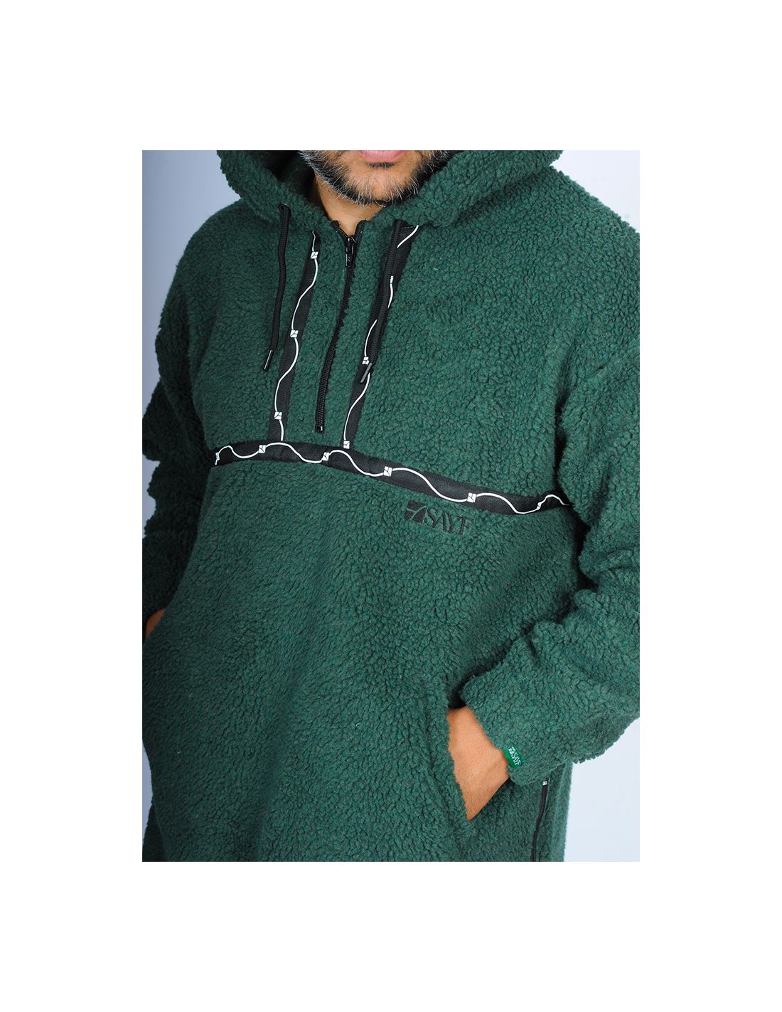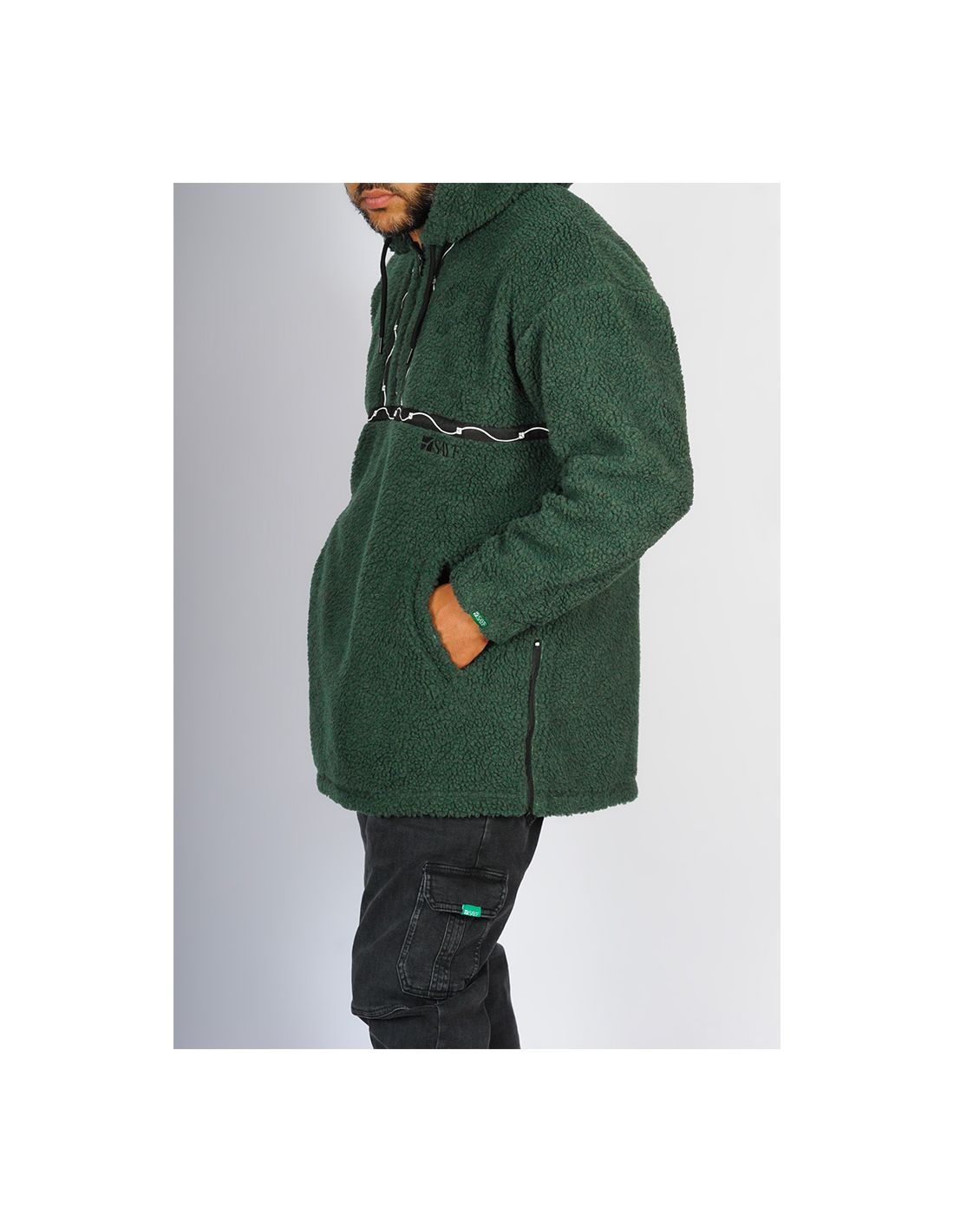 En coloris vert émeraude profond, il se démarque par son originalité et ses détails innovants : bandes en sérigraphie aux formes sinusoïdales qui encadrent le zip central, créant un contraste subtil et artistique.