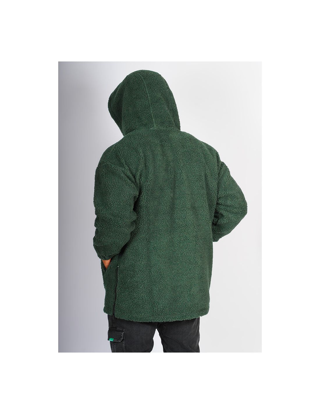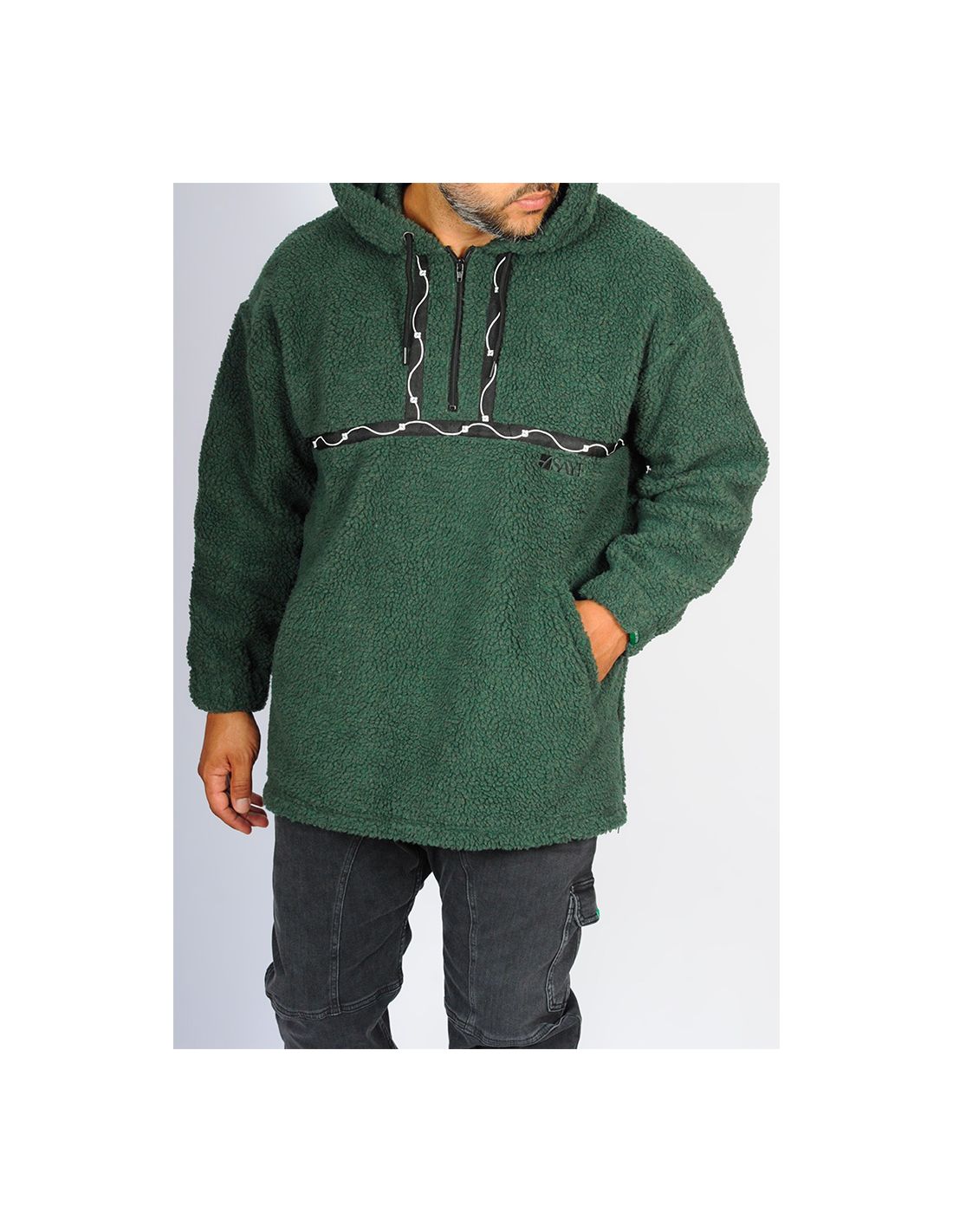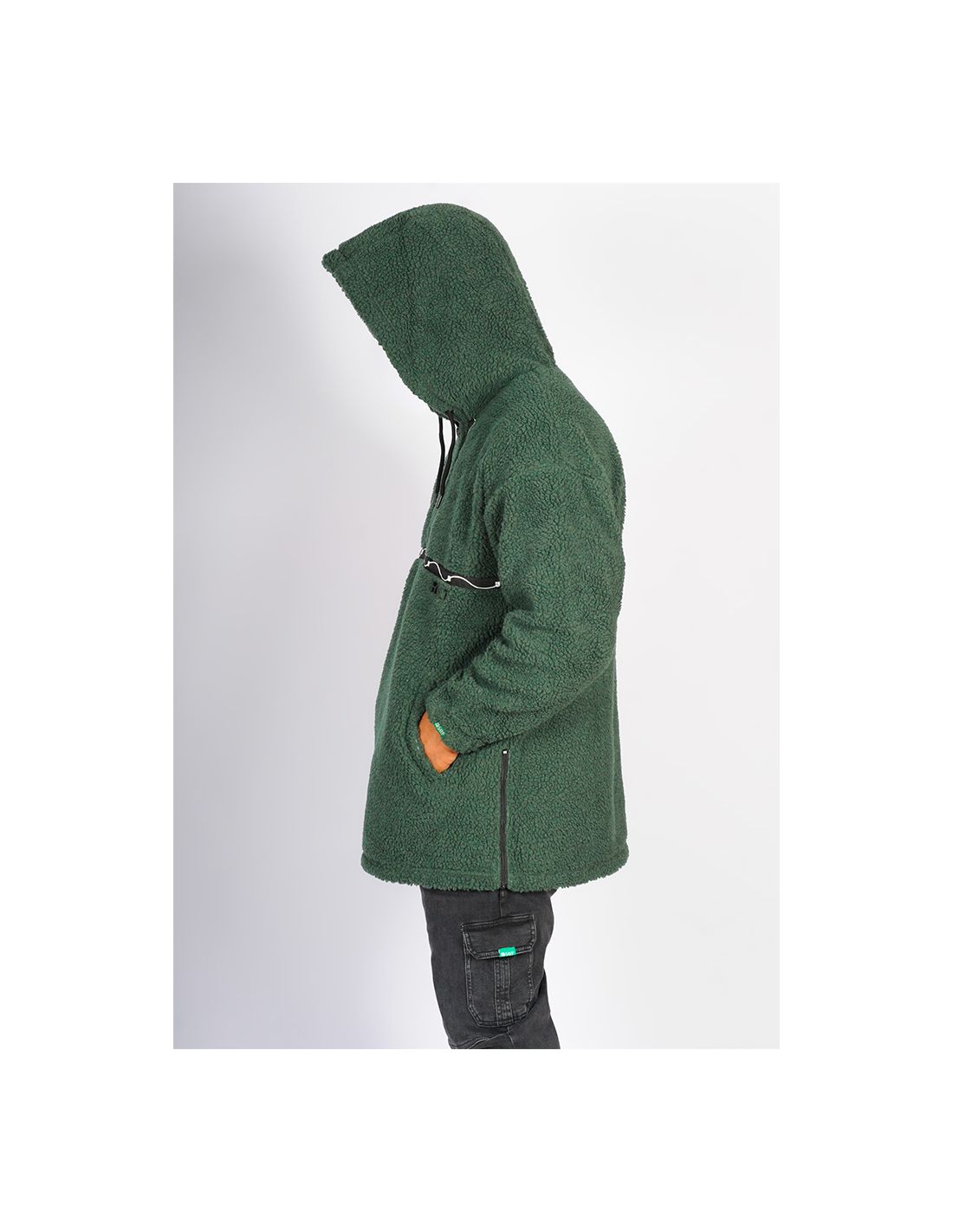 En coloris vert émeraude profond, il se démarque par son originalité et ses détails innovants : bandes en sérigraphie aux formes sinusoïdales qui encadrent le zip central, créant un contraste subtil et artistique.